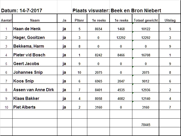 Omstreeks 12:45 uur zijn we met de 2e reeks begonnen, de winnaar van de ochtend kon in de middag geen potten meer breken hij ving in de middag nog 1 visje erbij en kwam niet verder dan 5e plaats. In de stromende regen ging Pieter v/d Bosch er eens flink voor zitten zonder paraplu had hij niet nodig, hij wint de wedstrijd met 16708 gram Anne-Dirk werd tweede met 12936 gram en Gooitzen Hager ( 1e reeks geen vis ) is 3e met 12292 gram.
