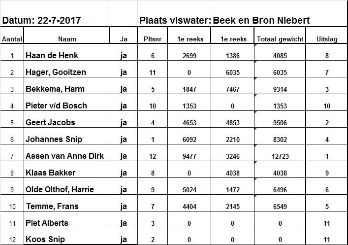 Na de eerste reeks weging is het Anne Dirk die met 9477 gram die aan de leiding gaat, en deze in de tweede reeks vast heeft gehouden hij ving er nog 3246 gram bij wat zijn totaal gewicht op 12723 gram.