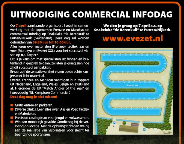 Als jij nu geinteresseerd bent in vissen op een Commercial is dit een fantastische gelegenheid om de fijne kneepjes van het vissen op het Snake Lake onder de knie te krijgen. Als je toevallig mee kan doen aan de FishOMania Qualifier zou ik hier op 7 april zeker een kijkje gaan nemen. Van 09.30 tot 16.00 gaan de toppers van Marukyu, Evezet en Frenzee aan de slag op het Snake Lake.