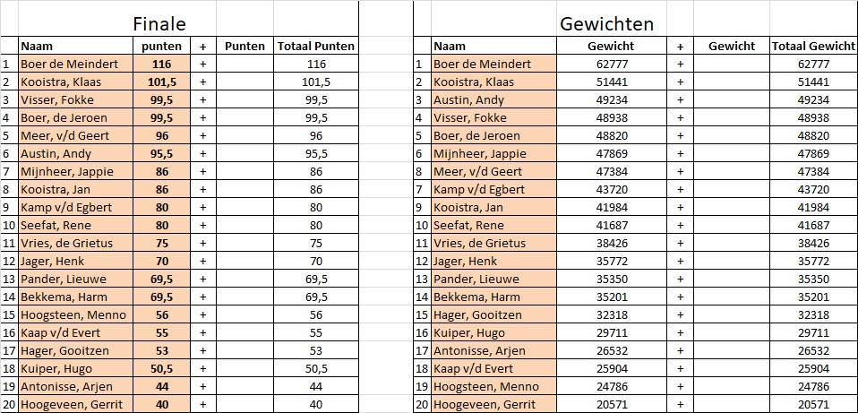 De deelnemers aan de finale zijn bekend. Een geweldige deelname. Van de twintig geplaatste vissers, helaas dat Redze Achttien moet afzeggen wegens ander verplichtingen en Johannes Storm blijkt niet lid te zijn van een van de regioverenigingen.