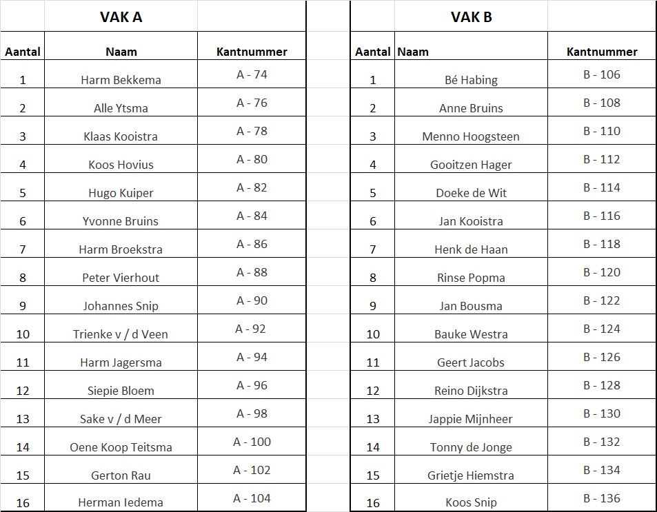 Op het filmpje is de loting te zien ( Alleen via Facebook te groot voor website ) en op de lijsten de vak indeling