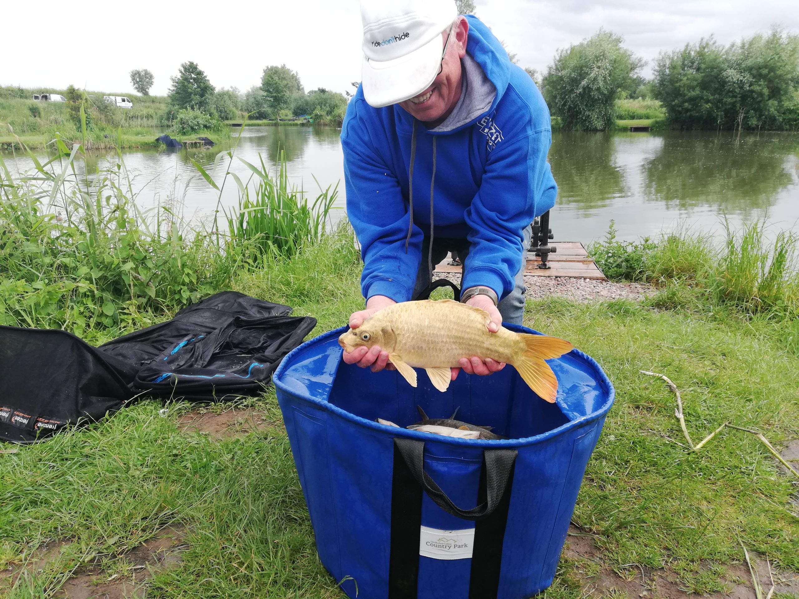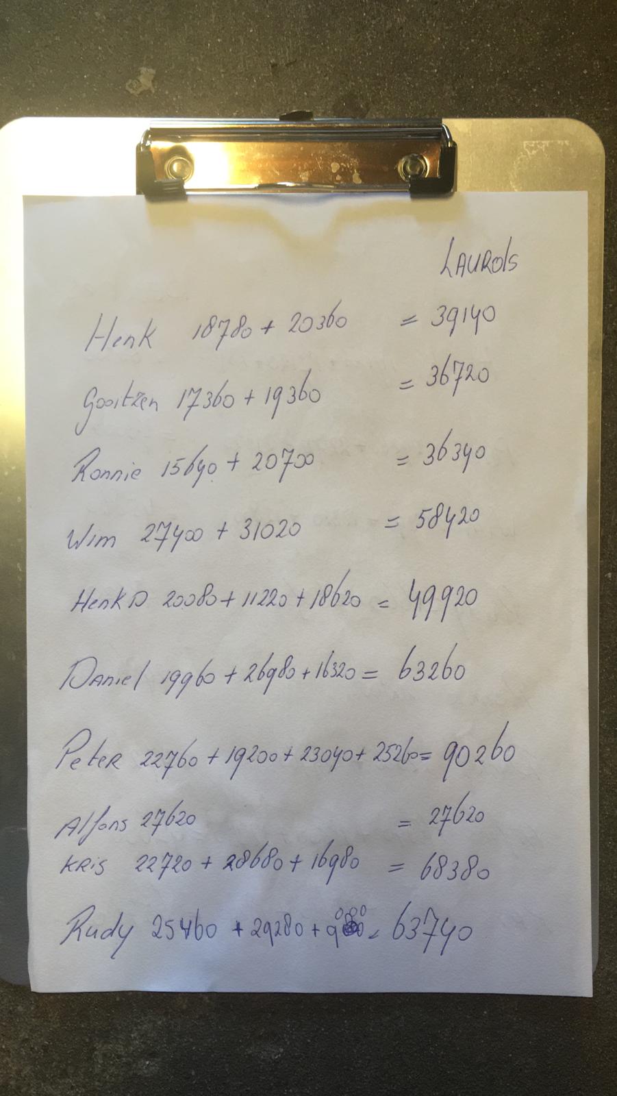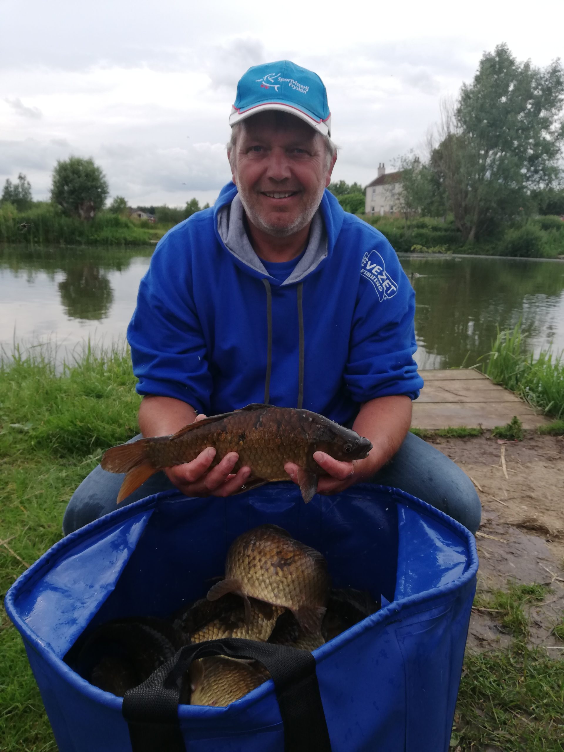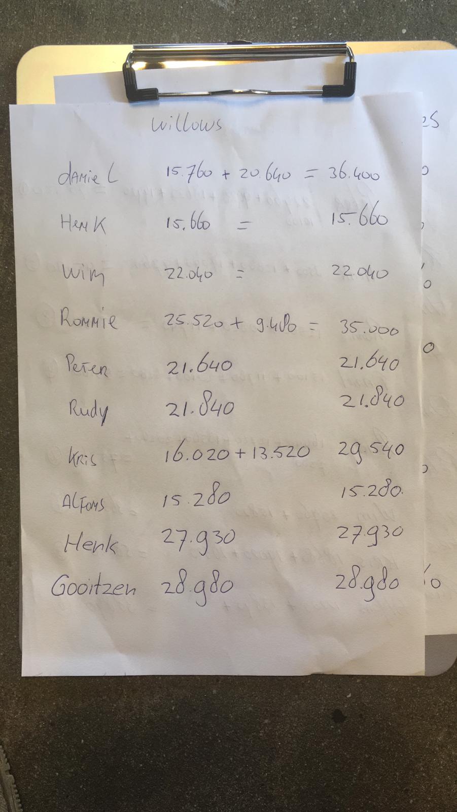Henk vangt een knoepert op de feeder deze tikt al snel de 6 kg aan, na nog enkele vissen krijgt hij een aanbeet deze denkt niet na en zwemt gewoon door tot aan de lijnclip toe, toen maar van de clip gehaald, ik vang met de vaste stok continu vissen van tussen de 2 en de 4 kg, Henk kan dit niet langer aanzien en besluit om ook met de stok te gaan vissen ook hij krijgt ze er flink op, op het einde had is 75 vissen dus ruim 150 Kg Henk had naar schatting een 50 tal en ging ruim over de 100 kg.