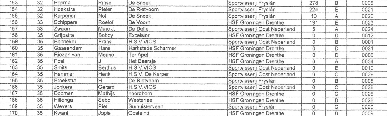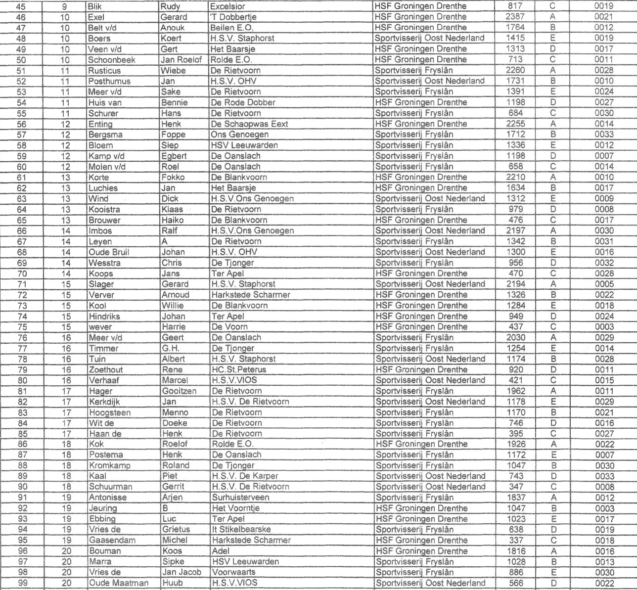 Tweede is John Potgieter van HSV Ons Genoegen van Sportvisserij OOst Nederland met 3828 gram, de derde plaats is behaald door Albert Meijer van HSV De Blankvoorn uit Blijham met 3592. De vierde plaats is voor Schelte Meijer van HSV De Rode Dobber uit Woltersum met 3189 gram en Lammert Marra van HSV Leeuwarden