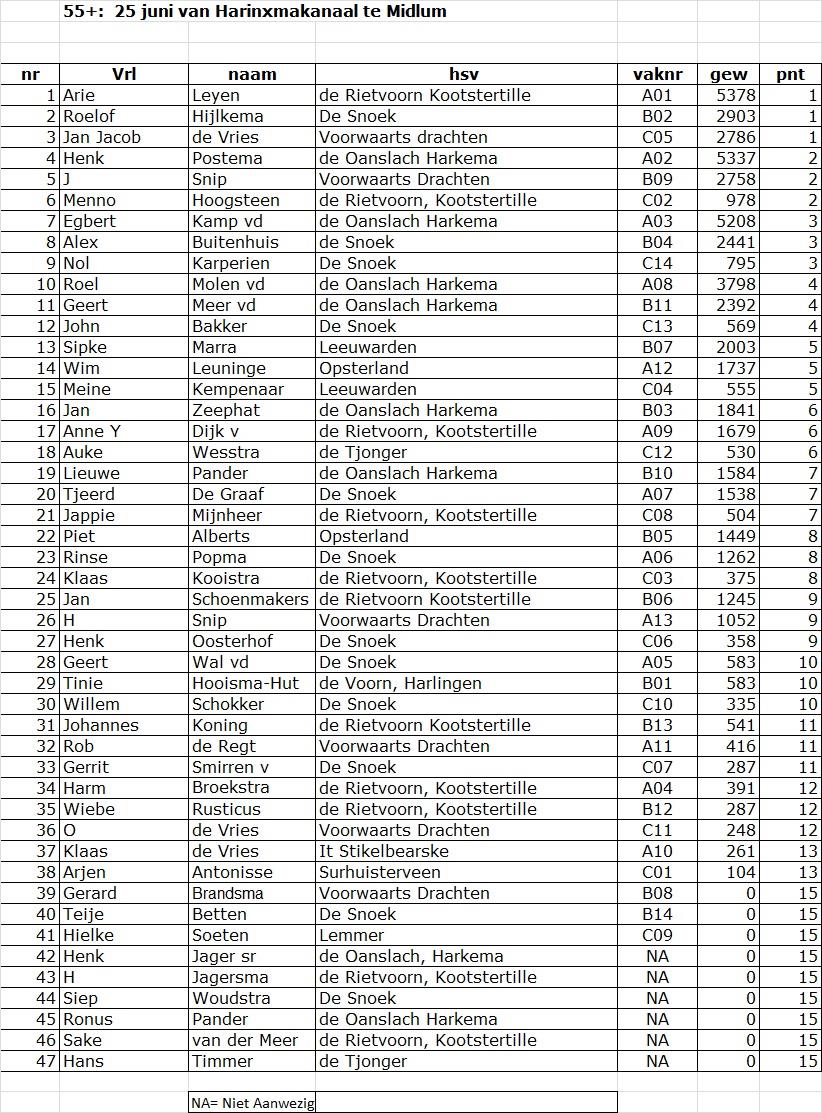 Ook het laatste Friese Kampioenschap van dit seizoen is achter de rug. De 55+ hebben hun tweede wedstrijd gevist langs het van Harinxmakanaal aan de Ungabuurt bij Midlum.