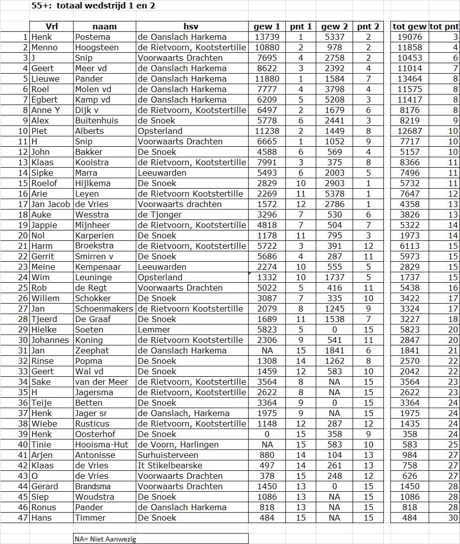Dit was ruim twee kilogram meer dan de nummer twee Roelof Hijlkema van H.s.v. de Snoek uit Wolvega hiermee vakwinnaar in vak B. In vak C was dit Jan Jacob de Vries van Voorwaarts uit Drachten de vakwinnaar met 2786 gram en dus derde in de dagscore.