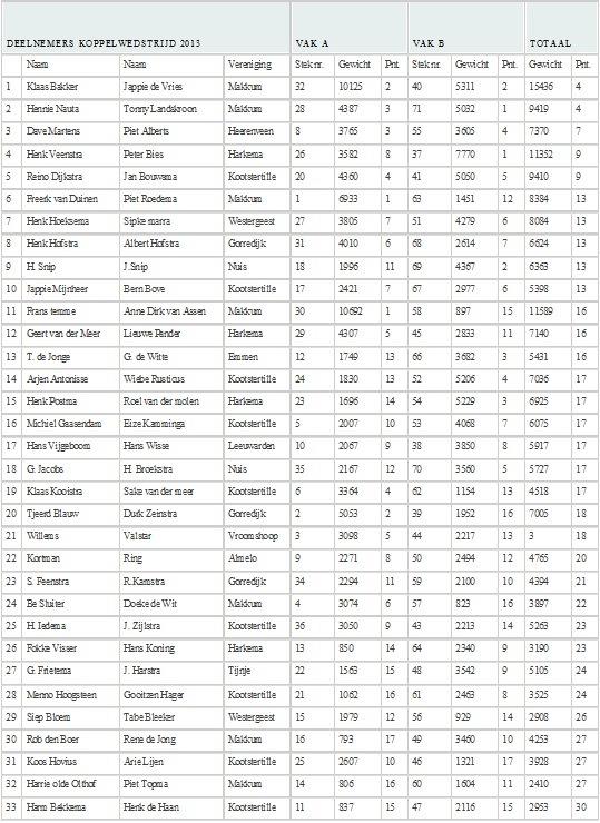 Op zaterdag 5 oktober organiseerde HSV Makkum weer de gescheiden koppelwedstrijd. Er deden dit jaar 33 koppels mee. Het was prachtig visweer en er werd goed vis gevangen! De lokaal goed bekende vissers vielen dit jaar goed in de prijzen. Het koppel Klaas Bakker en Jappie de Vries van HSV Makkum gingen er met de eerste prijs van door, op de voet gevolgd door Hennie Nauta en Tonnie Landskroon, eveneens van HSV Makkum.