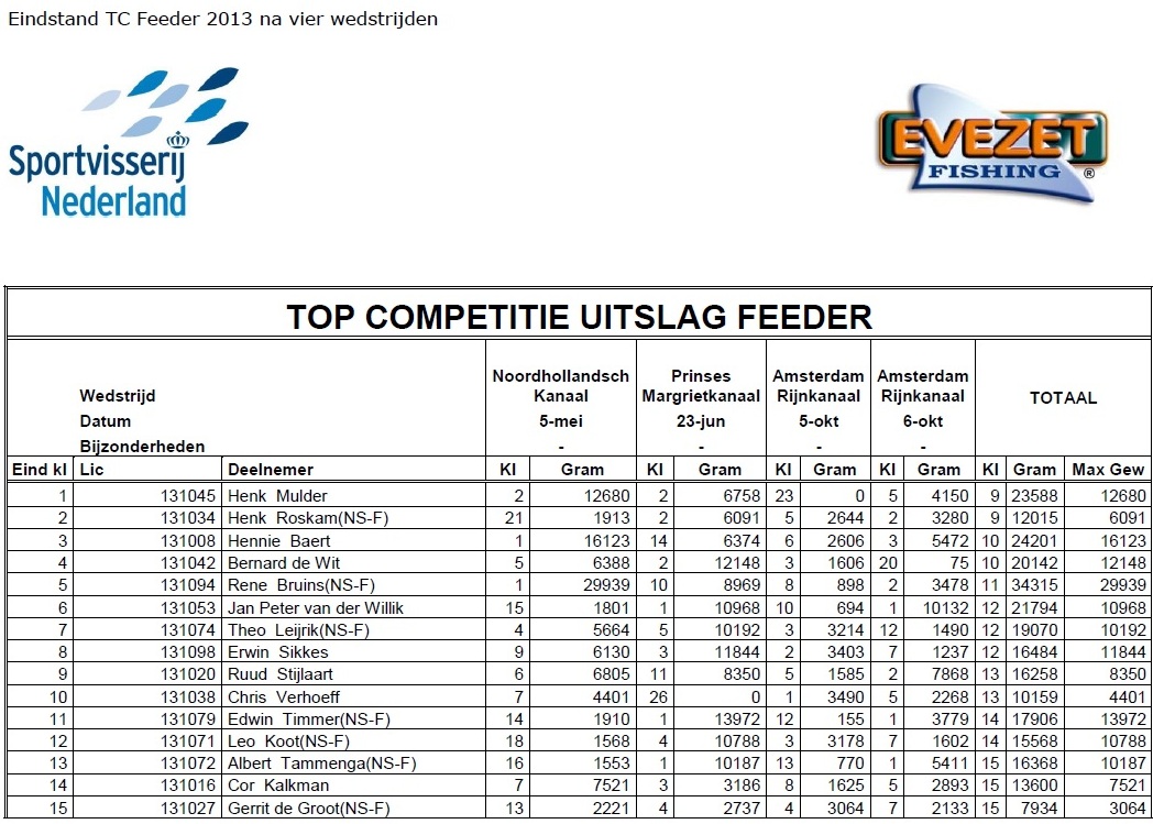 In de topcompetitie vissen de landelijke specialisten 4 wedstrijden op verschillende locaties. In totaal hebben 113 sportvissers meegedaan aan de competitie. De laatste wedstrijd is afgelopen weekend gevist in het Amsterdam-Rijnkanaal bij Maarssen.