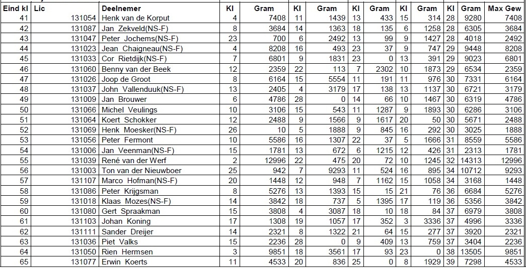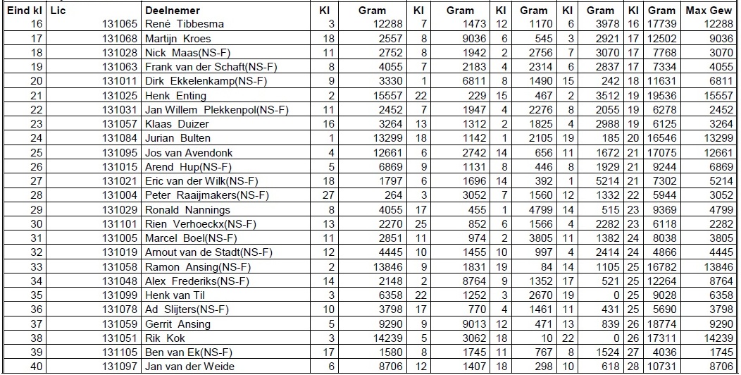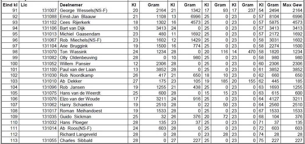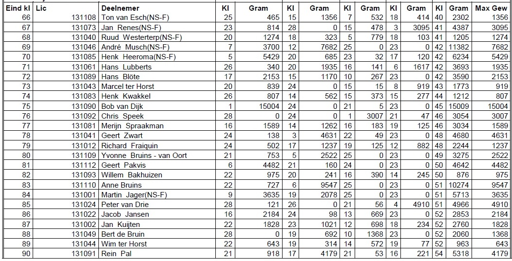 Hierna kon de einduitslag worden vastgesteld en bleek Henk Mulder met 9 punten en 23.588 gram de winnaar te zijn.. Henk Roskam werd 2e met eveneens 9 punten, maar aanmerkelijk minder gewicht ( 12.015 gram). Hennie Baert eindigde op de 3e plaats met 10 punten en 24.201 gram.