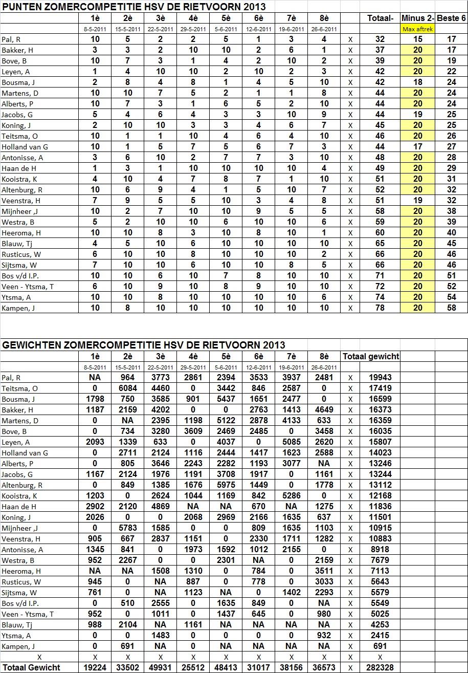 Het einde van de competitie is weer bereikt en zoals bij elke wedstrijd kan er maar 1 de winnaar zijn en dit jaar is dat Rein Pal met 17 punten en een totaal gewicht van 19943 gram de runner up 2è is H. Bakker eveneens met 17 punten maar iets minder gewicht namelijk 16373 gram en de 3è plaats word bezet door B. Bove met 19 punten en een totaal gewicht van 16035 gram.