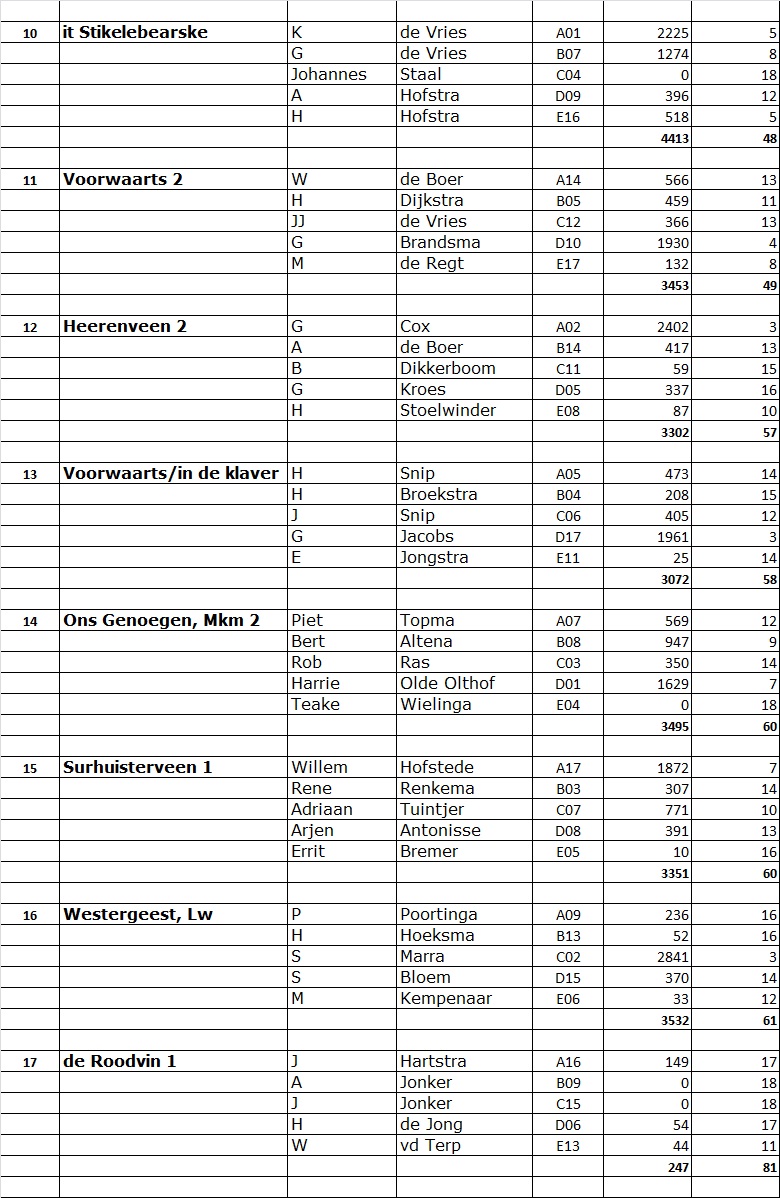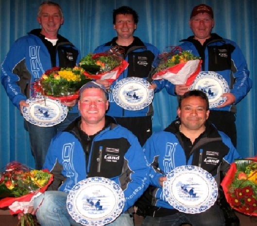 De onderlinge verschillen waren gering maar het team Land van HSV de Oanslach, Harkema (zie foto: achter vlnr; Henk Land, J. Koning, Klaas Mozes, voor Fokke Visser en Dave Martens) wist met 4 punten verschil boven het BKM 1 team tevens van hsv de Oanslach te eindigen.