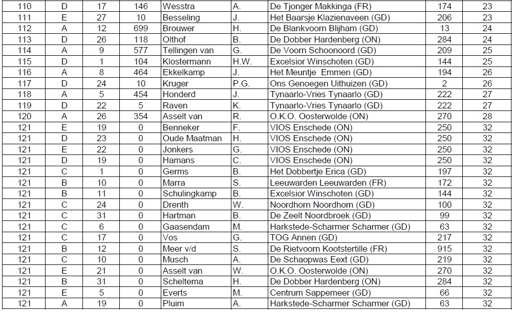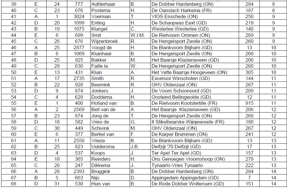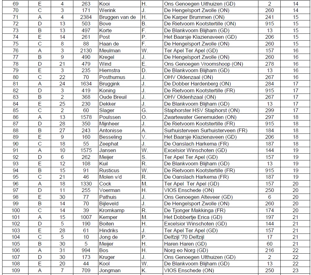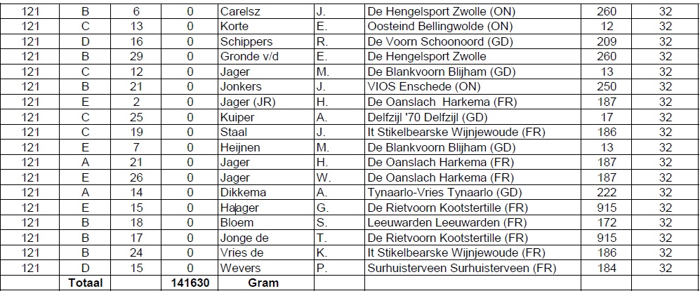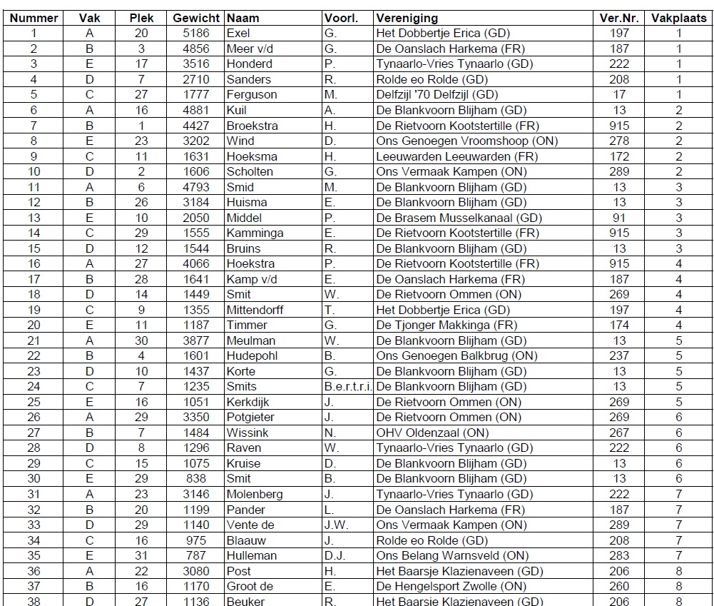 De man die deze felbegeerde titel uiteindelijk heeft gewonnen, de heer G. Exel van Het Dobbertje uit Erica, had maar liefst 5186 gram in het weegnet aan het einde van de wedstrijd. De nummer twee, de heer G. van der Meer van De Oanslach uit Harkema, kon 4856 gram laten wegen. De nummer drie is geworden de heer P. Honderd van Tynaarlo-Vries uit Tynaarlo. Hij ving 3516 gram. De vierde plaats was voor de heer R. Sanders van Rolde en omstreken met 2710 gram. En met 1777 gram op de vijfde plaats komt de heer M. Ferguson van Delfzijl ’70.