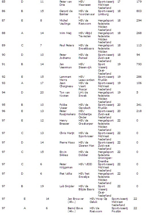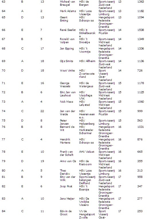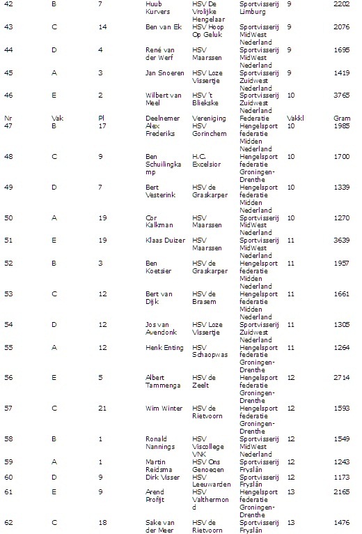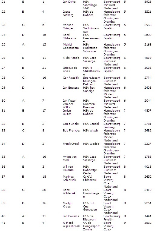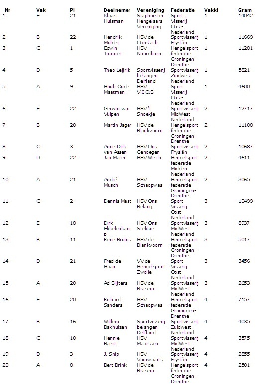 Klaas Huisman van de Staphorster HSV (Oost-Nederland) werd met 14.042 gram de nieuwe Nederlands Kampioen Feeder. Op de 2e en 3e plaats eindigden Hendrik Mulder van HSV De Oanslach (Sportvisserij Fryslân) met 11.669 gram en Edwin Timmer van HSV Noordhorn (Hengelsportfederatie Groningen Drenthe) 11.281 gram.