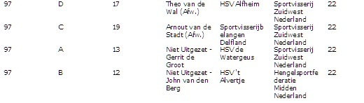 De vangsten bestonden voornamelijk uit brasem, baars, voorn en kolblei gevangen. Ook werd er een snoek gevangen, die echter niet meetelt.