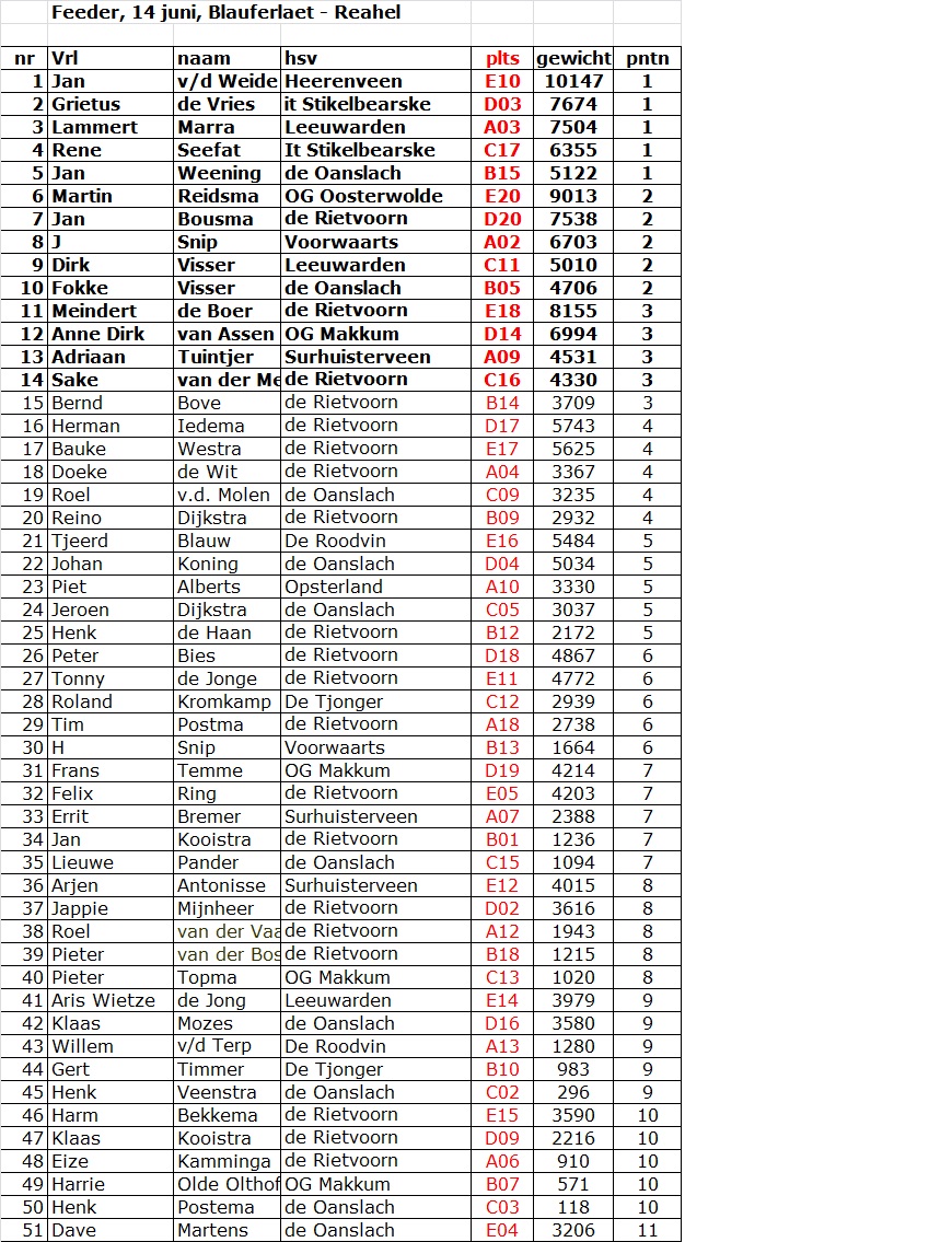 Vandaag, zaterdag 14 juni, vond het Friese Kampioenschap feedervissen plaats op het bekende wedstrijdtraject PM Kanaal Blauforlaet tussen Stroobos en Reahel. Met de wind in de rug, een aangename temperatuur en nog in de roes van Nederland-Spanje was het een aangename wedstrijd.