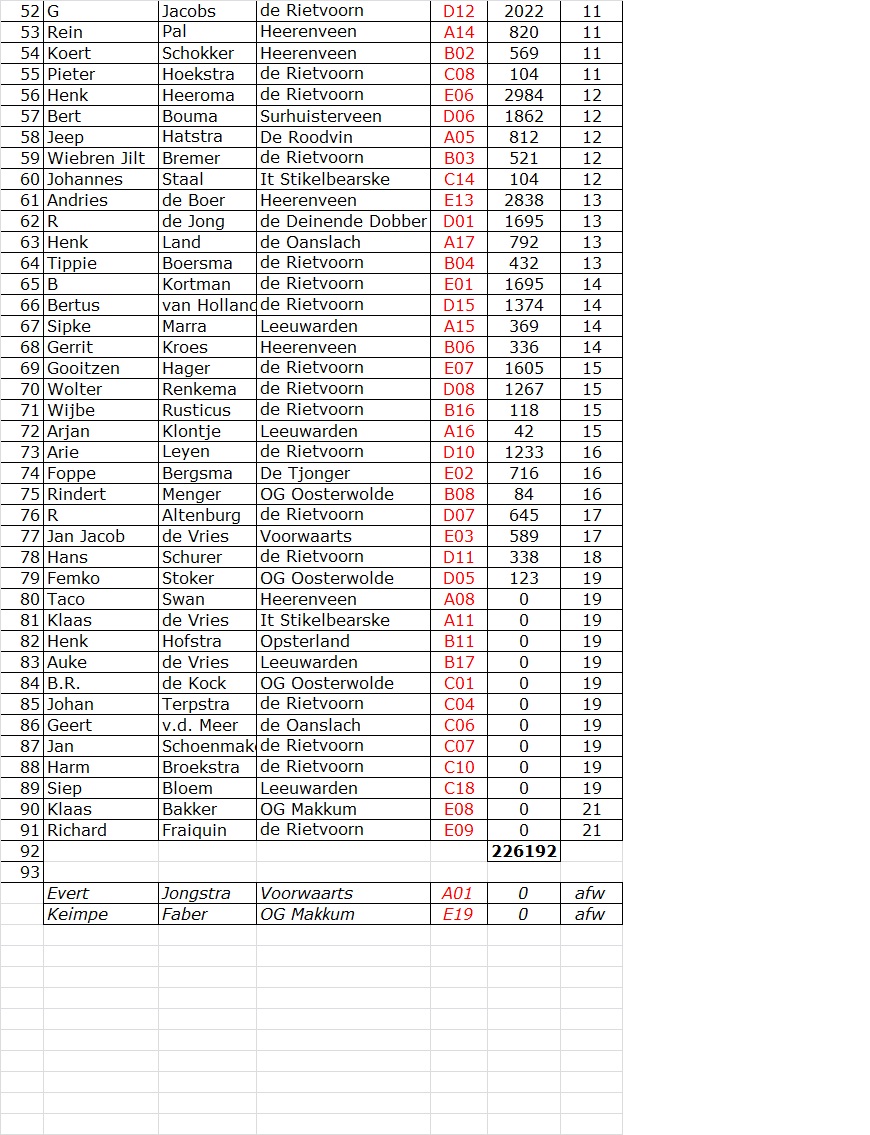 De nummer 2, Grietus de Vries van HSV it Stikelbearske, had 7,6 kg en de nummer 3 Lammert Marra van HSV Leeuwarden had met 7,5 kg slechts 100 gram minder gevangen.