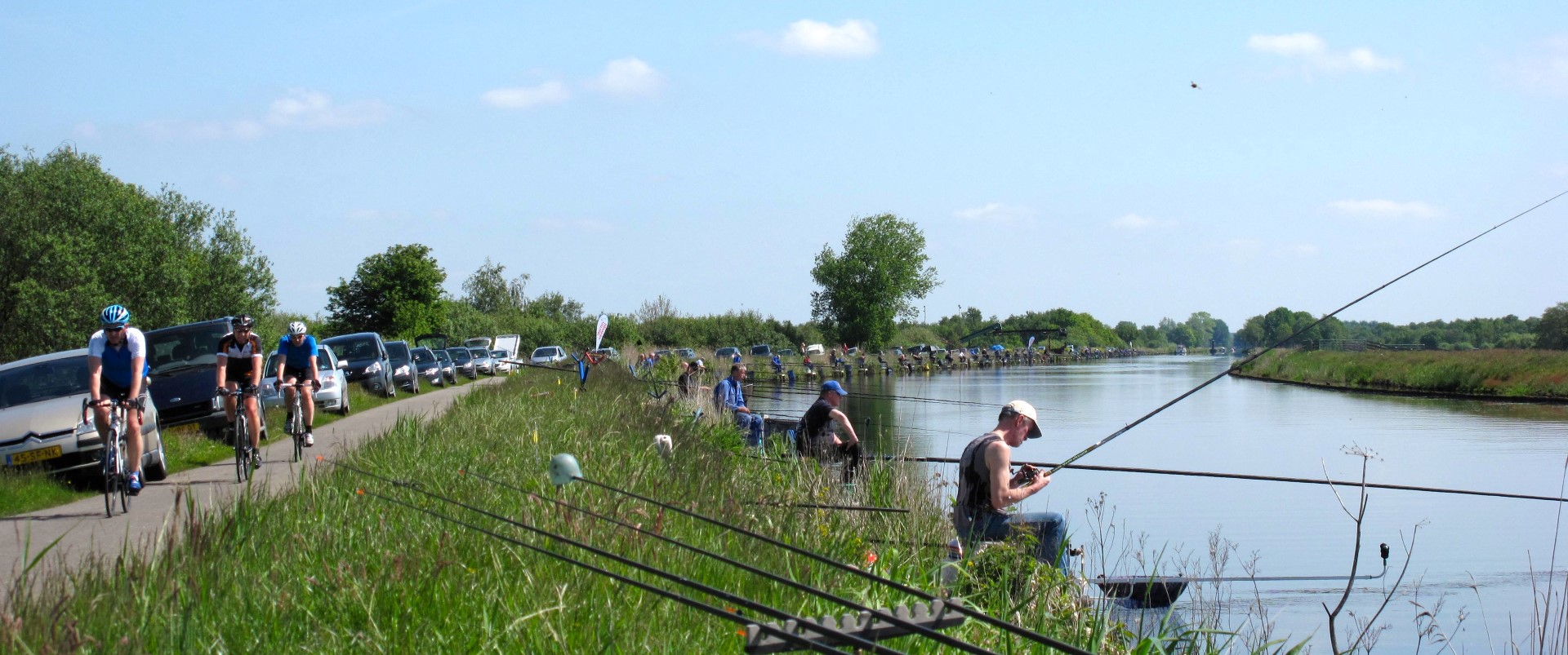 Bijna 110 sportvissers op een rij in heerlijk zonnig weer met een briesje in de rug. Sterk geconcentreerd met een 13 meter lange hengel, vissend vanaf hun indrukwekkend plateau op de nieuwe vissteigers aan de Hooivaart. Turend naar hun ranke dobber om elk moment de winnende vis aan de haak te kunnen slaan. Dit was het beeld tijdens de Friese Kampioenschappen wedstrijdvissen op zaterdag 17 mei langs de Hooivaart bij de Deelen.