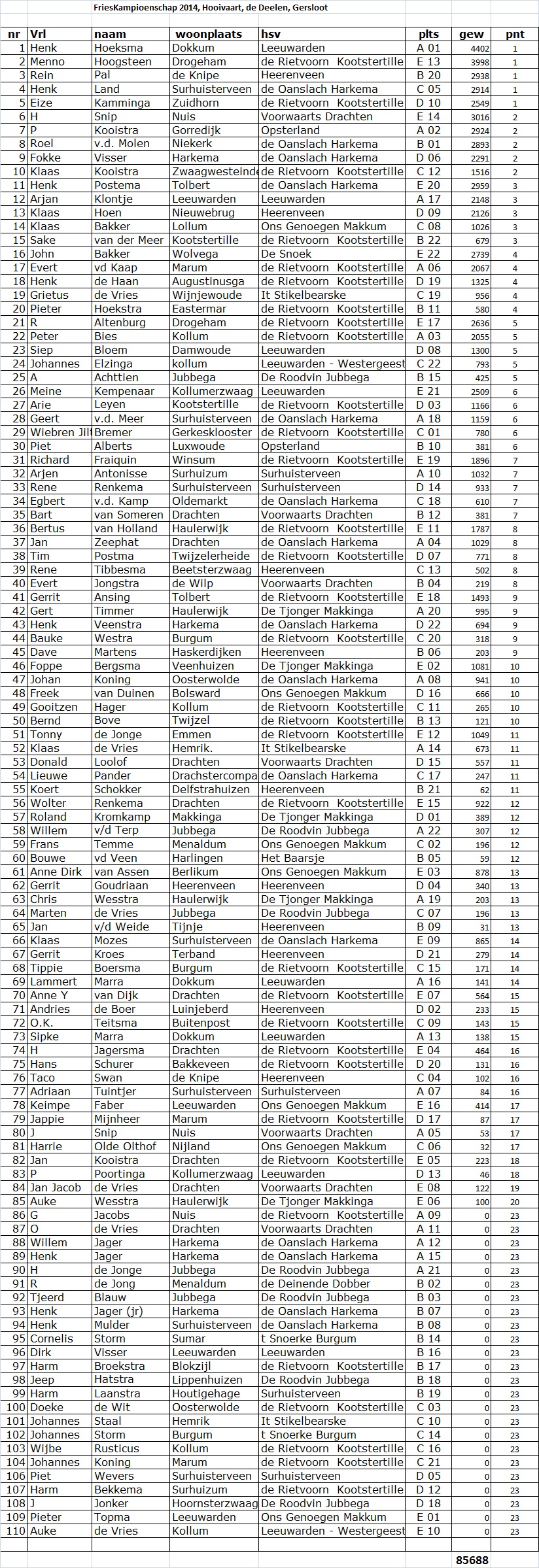 Na de 4 uur durende wedstrijd wist Henk Hoeksma uit Dokkum en vissend voor ‘Hengelsportvereniging Leeuwarden’ bijna 4,5 kg vis te vangen en is daarmee Fries kampioen 2014 (zie foto).
