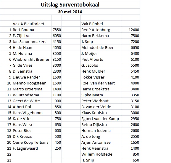In het vak op Rohel waren de vangsten gemiddeld gezien beter dan op Blauforlaet. René Altenburg ving stug door en aan het eind gaf de weegschaal bij hem 12.400 gram aan. René bleef de overige deelnemers een straatlengte voor en is dan ook de terechte winnaar van de Surventobokaal in 2014. Het podium op het vak op Rohel werd gecomplementeerd door Harm Bekkema (7500 gram) en J. Snip (7200) gram.