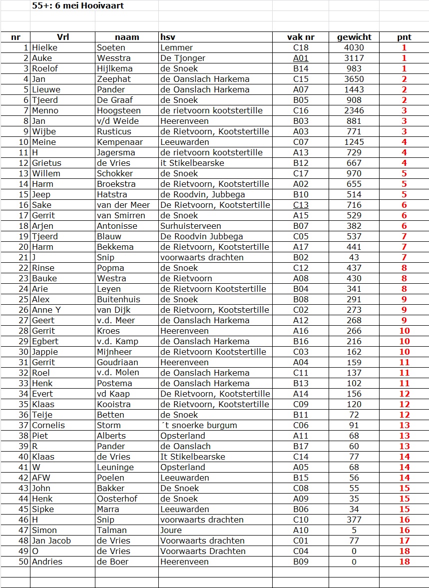 Afgelopen dinsdag, 6 mei, is de eerste wedstrijd van het Fries Kampioenschap 55+ gevist op de steigers in de Hooivaart nabij de Deelen.