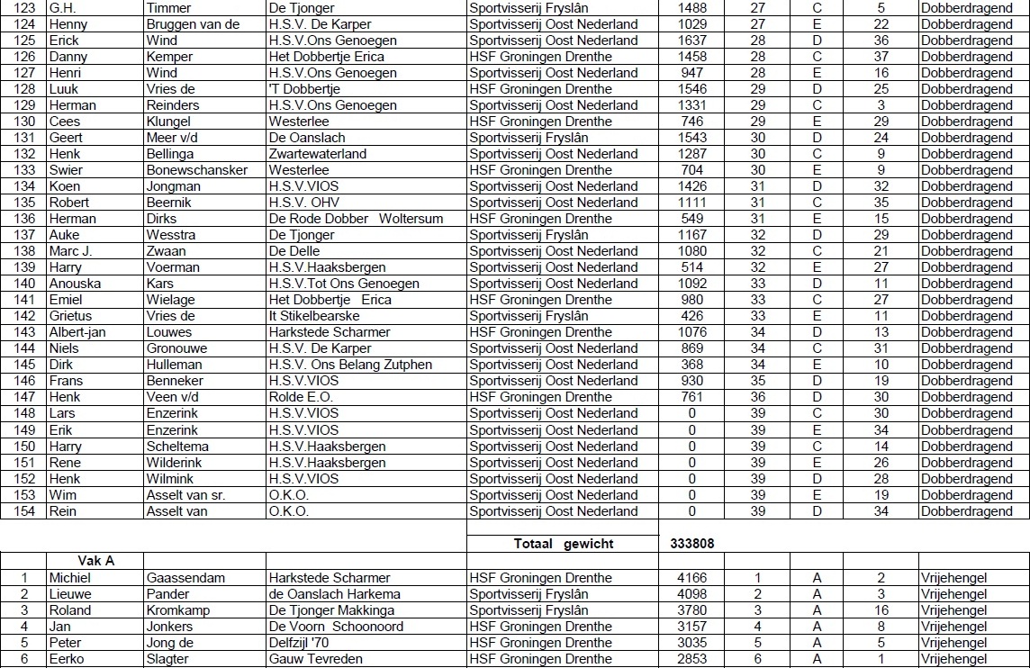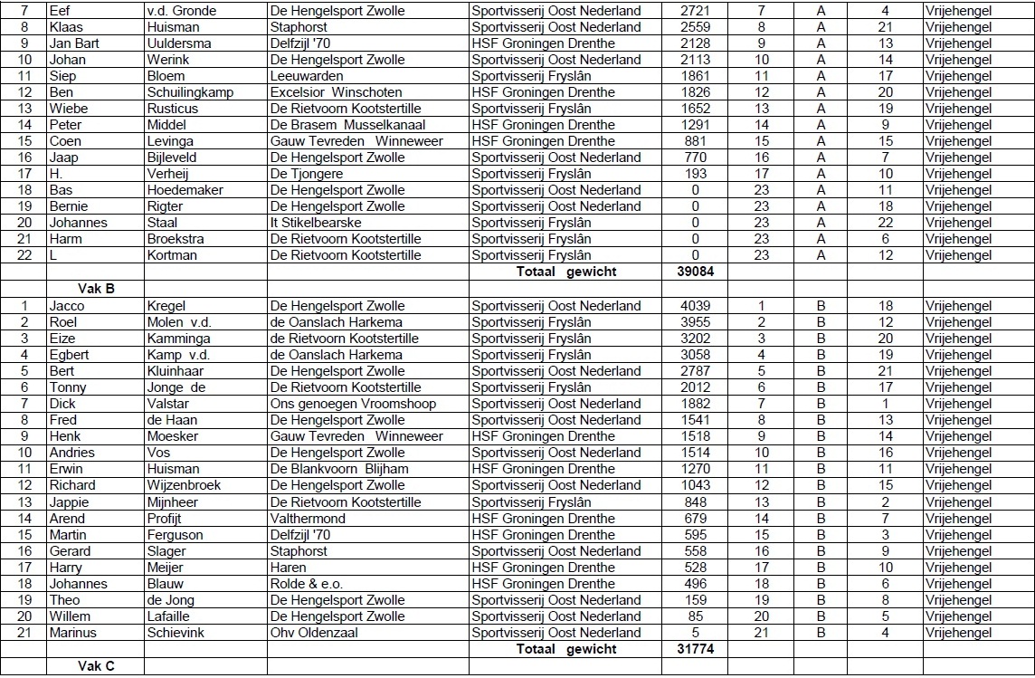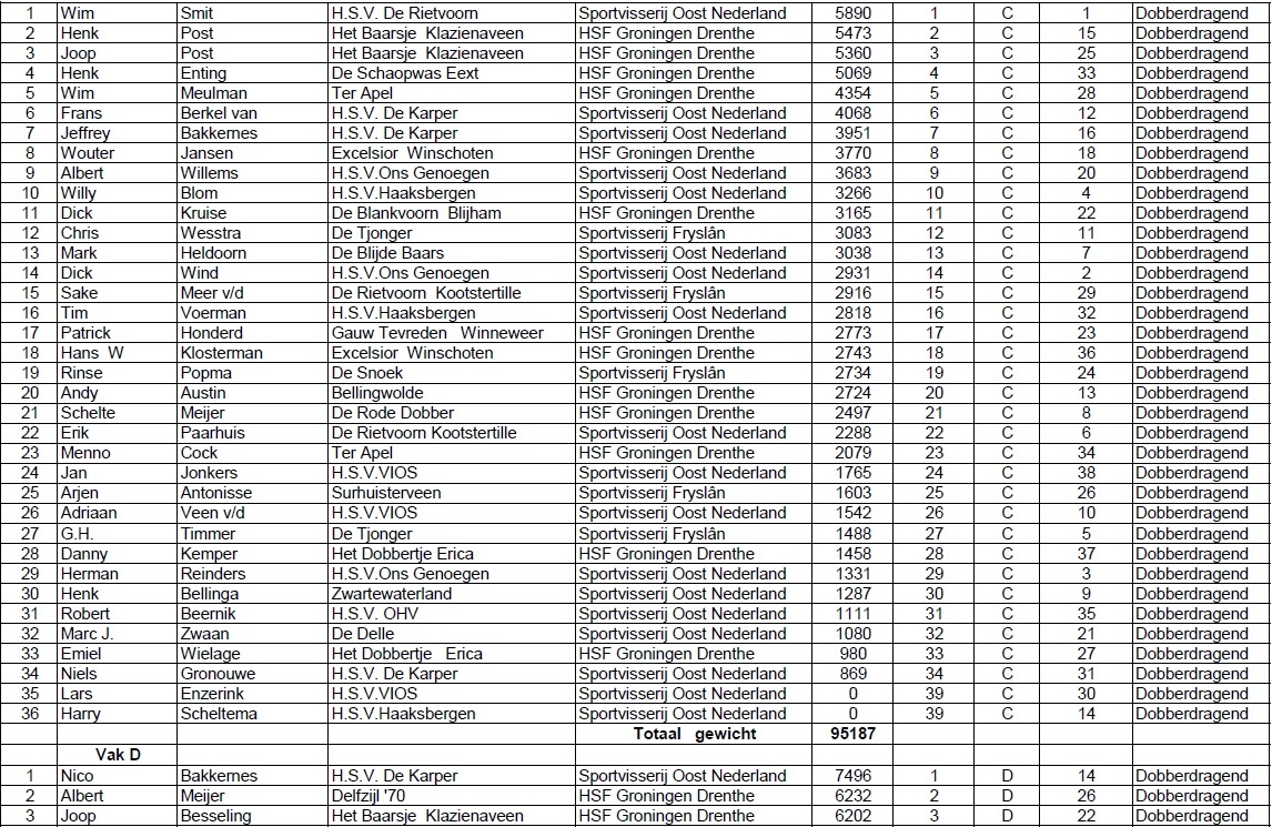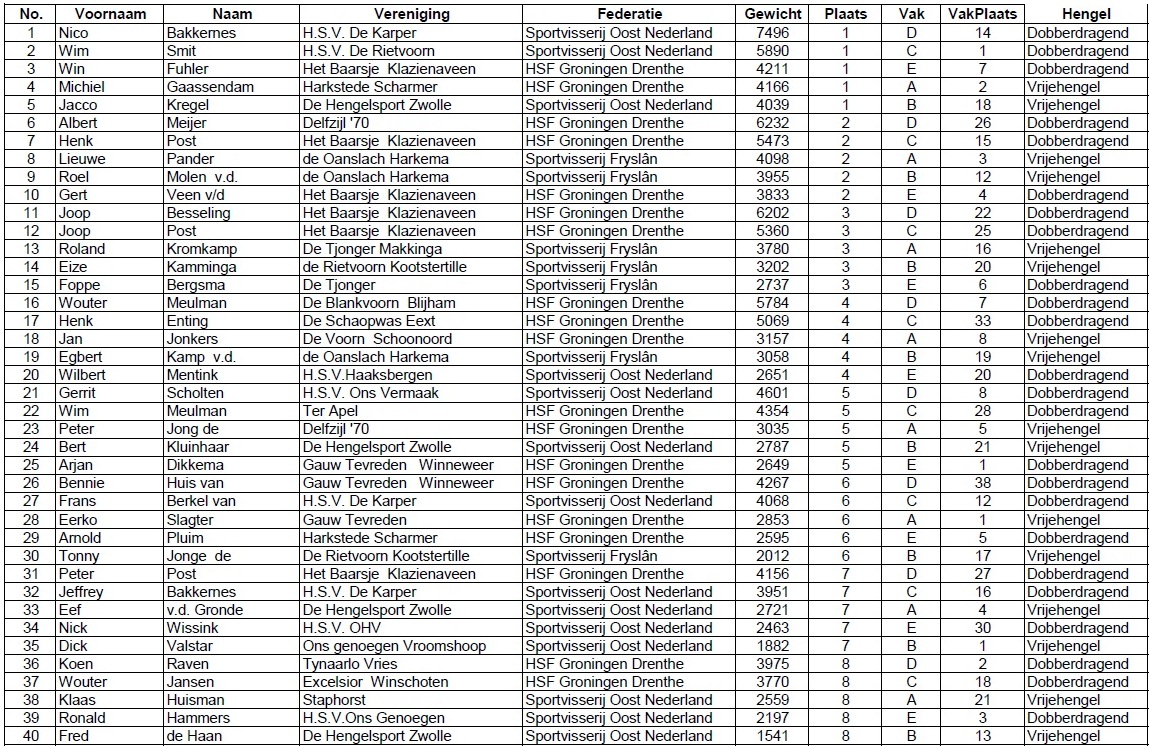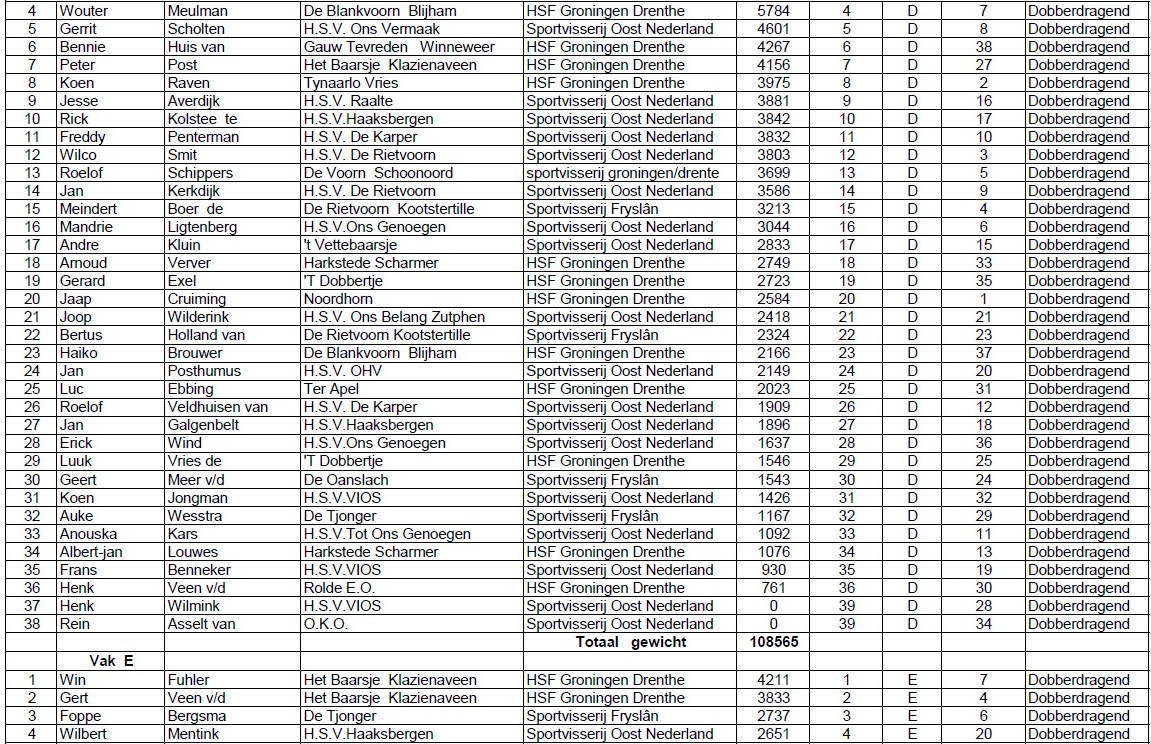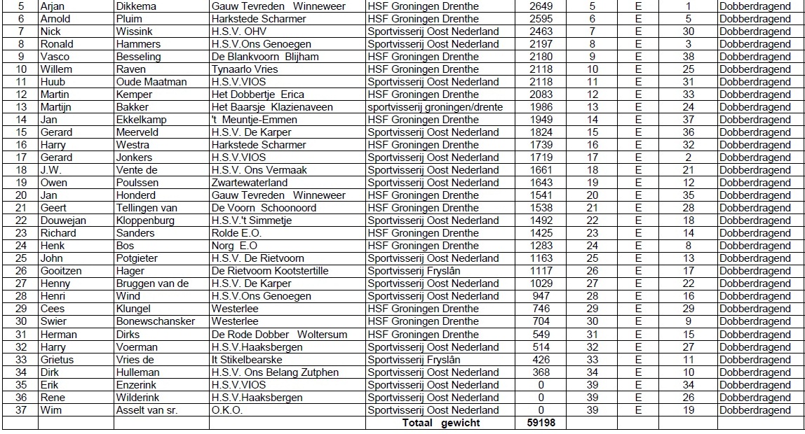 De vijfde plaats is voor Jacco Kregel van de Hengelsport Zwolle, Sportvisserij Oost Nederland. Hij ving 4039 gram.
