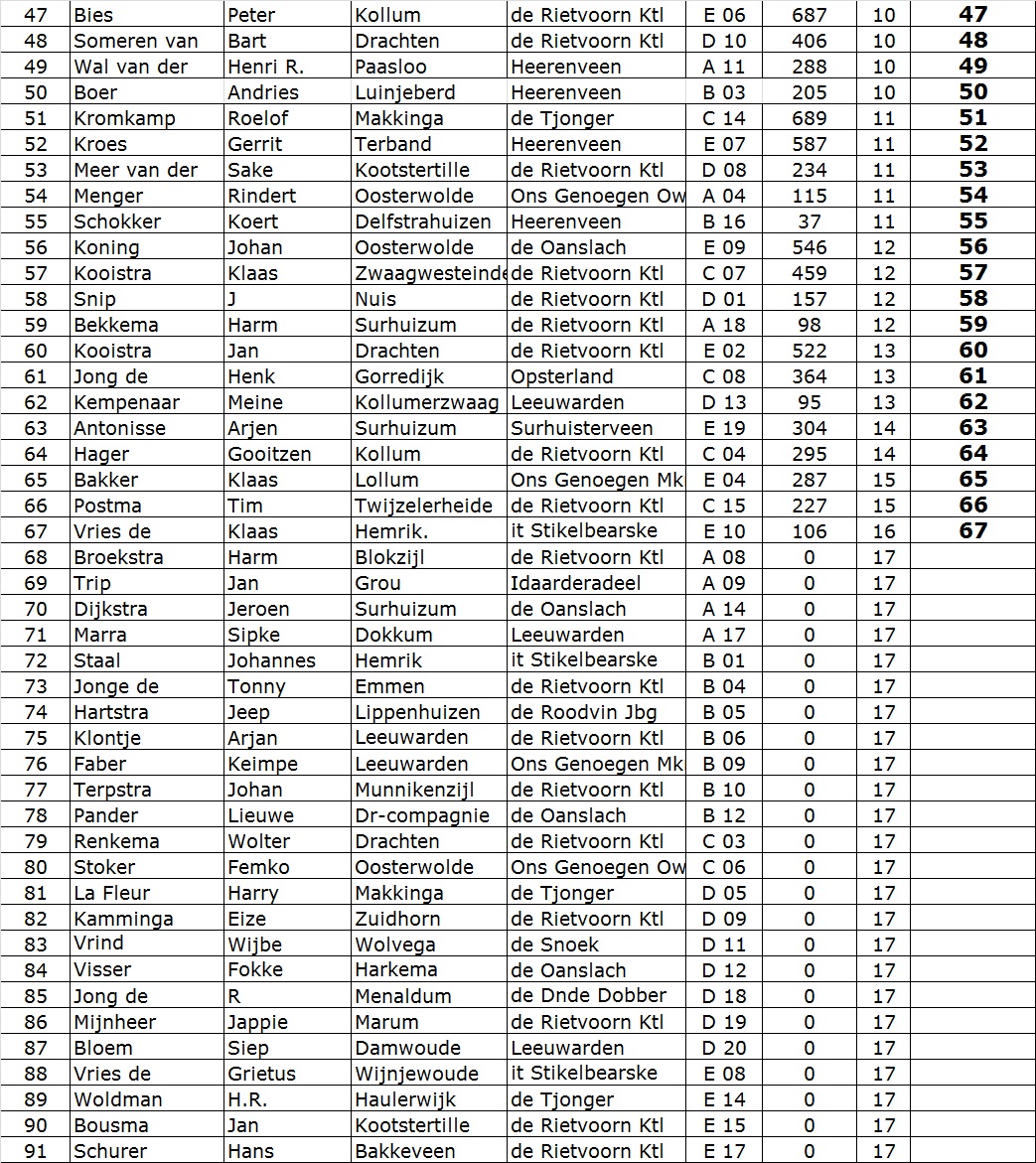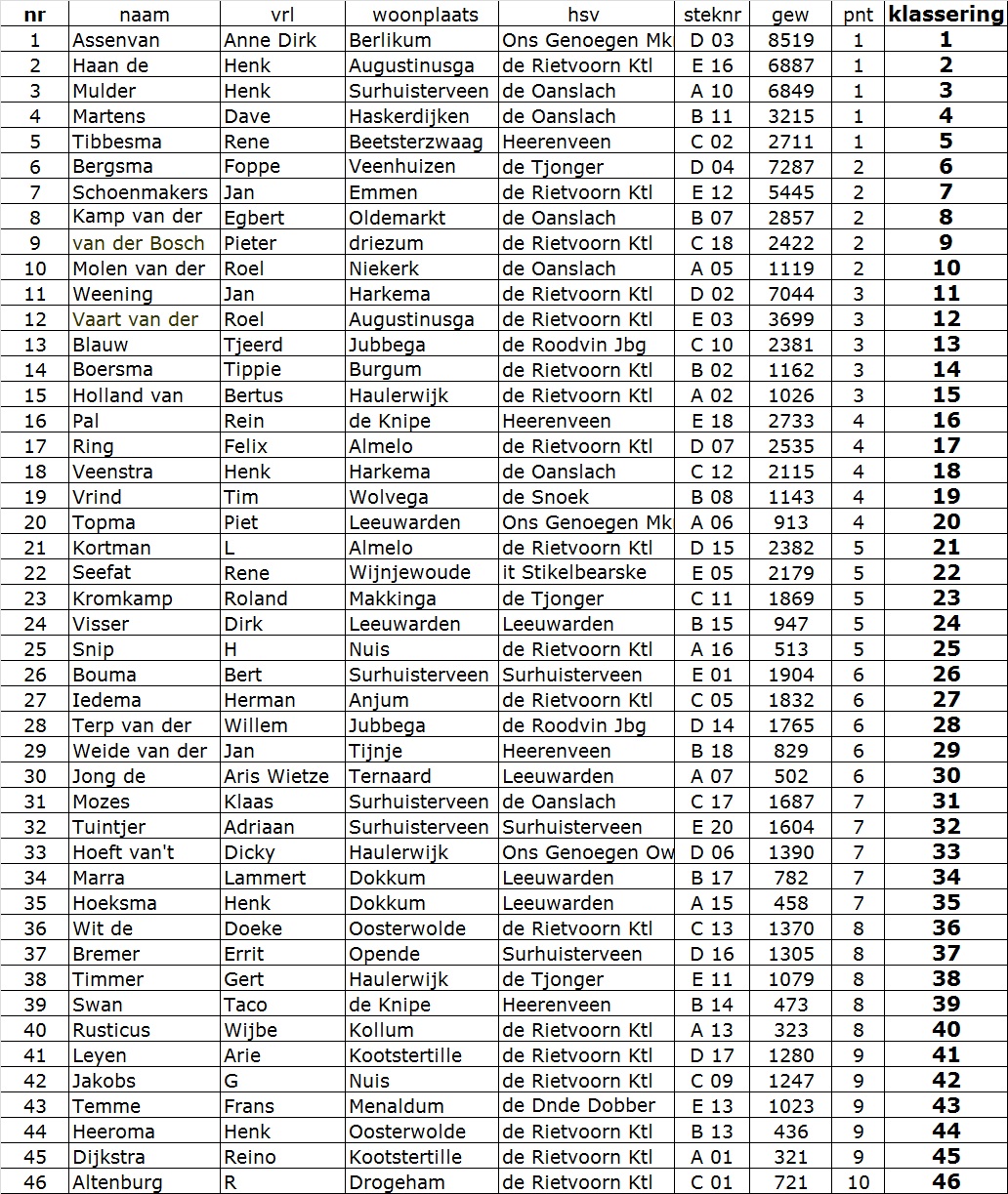 De nummer 2, Henk de Haan van HSV de Rietvoorn uit Kootstertille, had 6887 kg en de nummer 3 Henk Mulder van HSV de Oanslach uit Harkema had met 6849 kg slechts 38 gram minder gevangen.