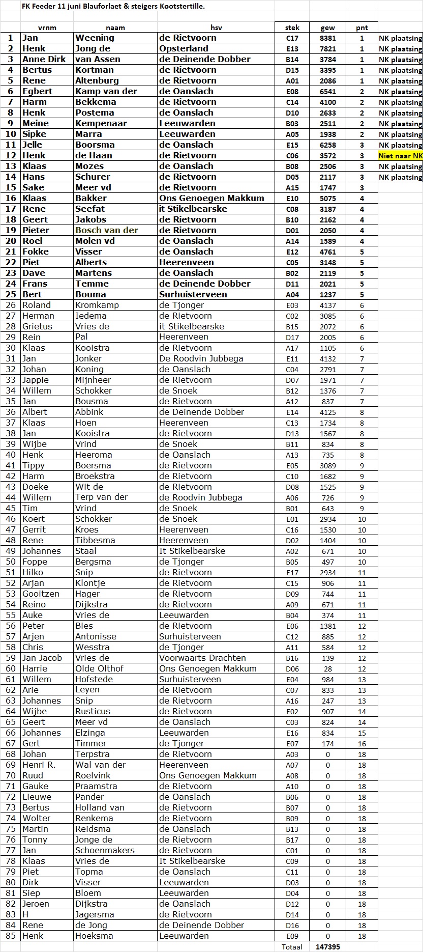 Zaterdag 11 juni, vond het Friese Kampioenschap feedervissen plaats op het bekende wedstrijdtraject PM Kanaal Blauforlaet/Reahel en op de steigers bij Kootstertille.