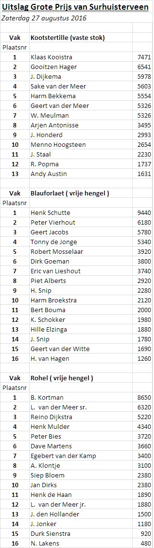 De jaarlijkse Grote Prijs van Surhuisterveen trok iets meer dan 50 deelnemers een mooi aantal sportvissers. gelukkig was er dit jaar genoeg animo voor de vaste stok, er is besloten om dit volgend jaar weer op het programma te zetten.