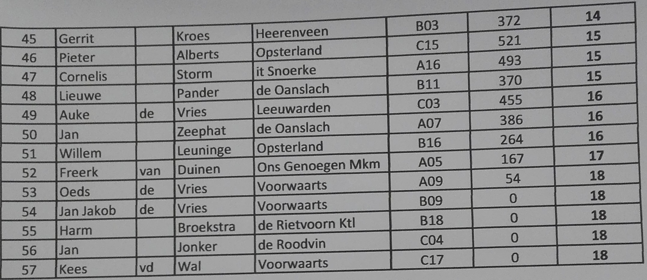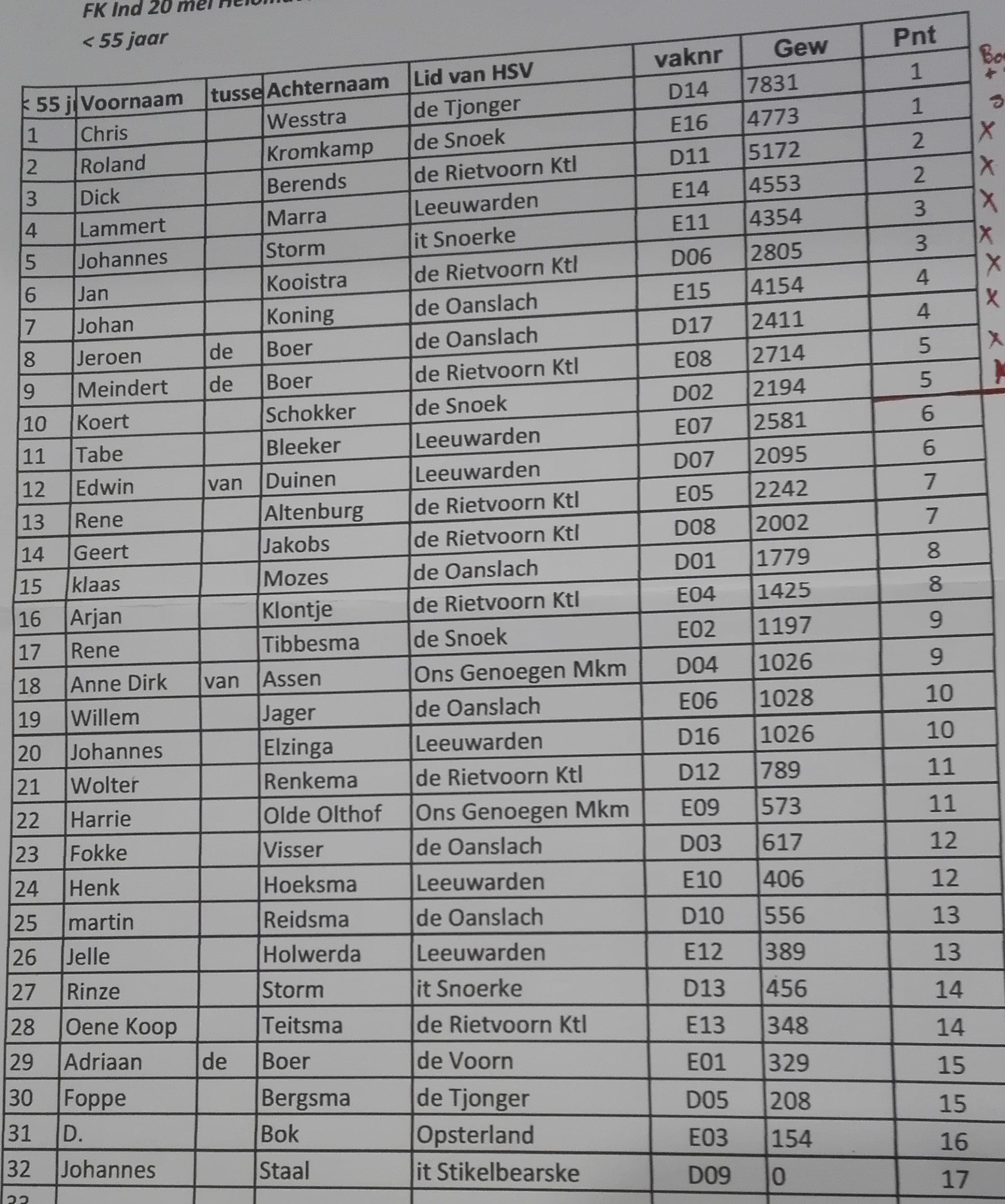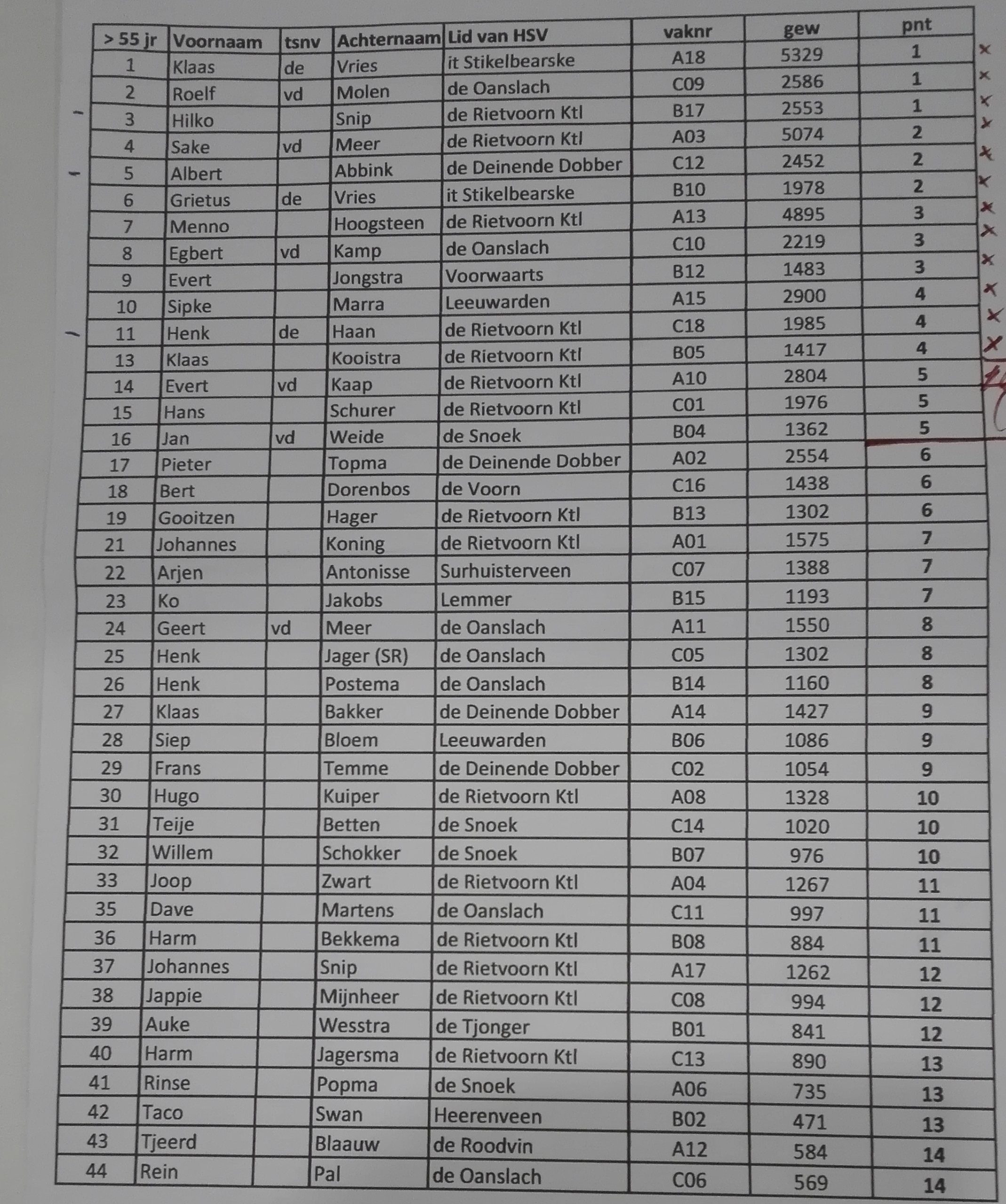 In de 55+ categorie werd er in drie vakken gevist. De vakwinnaar van vak A, Klaas de Vries van HSV it Stikelbearske (Wijnjewoude) wist de meeste vis te vangen; ruim 5 kg en ontving daarvoor het FK Kampioensbord. Vak winnaar C, Roelf v.d. Molen van HSV de Oanslach (Harkema) werd met 2,5 kg tweede en de derde vakwinnaar, Hilko Snip van HSV de Rietvoorn (Kootstertille), had slecht 33 gram minder gevangen.