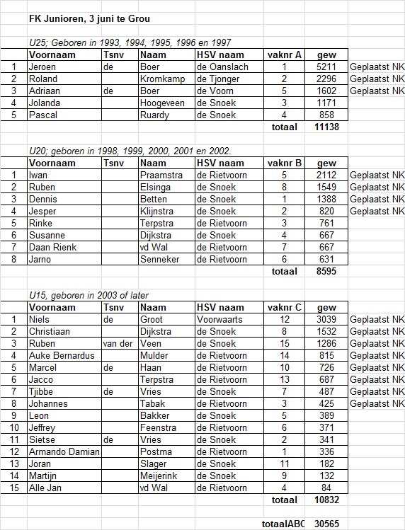 Bij de oudste jeugd’ t/m 25 jaar was het Jeroen de Boer van H.s.v. de Oanslach Harkema, met 5211 gram die Roland Kromkamp met 2296 gram voor bleef de nr 3 in deze categorie is Adriaan de Boer met 1602 gram.