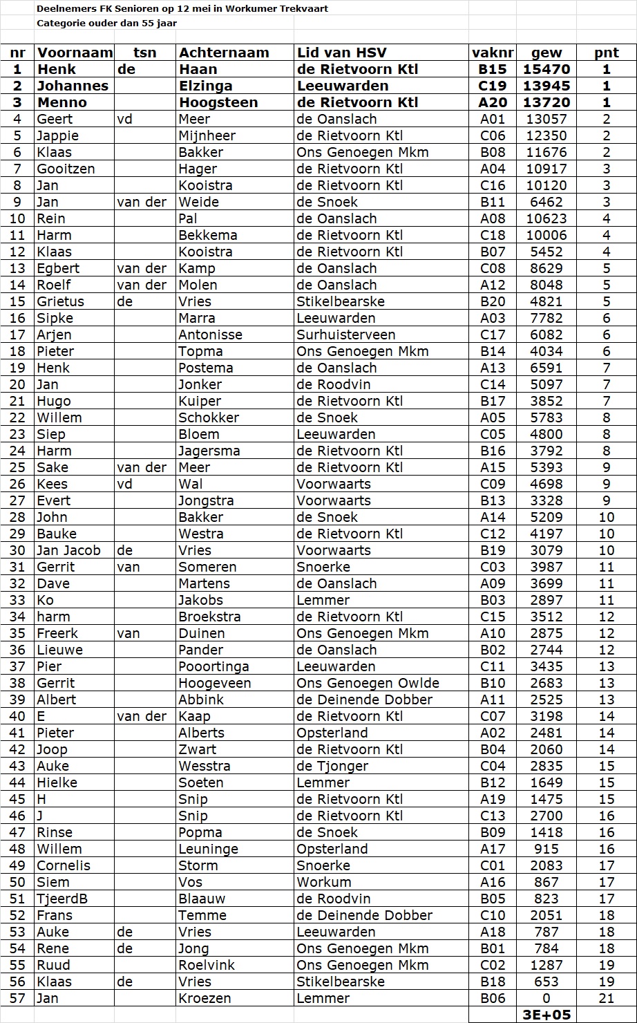 In de 55+ categorie werd in drie vakken gevist. De vakwinnaar van vak B, Henk de Haan van ‘HSV de Rietvoorn, Kootstertille’ wist de meeste vis te vangen; ruim 15 kg. Hij ontving daarvoor het Kampioensbord en is daarmee de zeer terechte Fries kampioen.