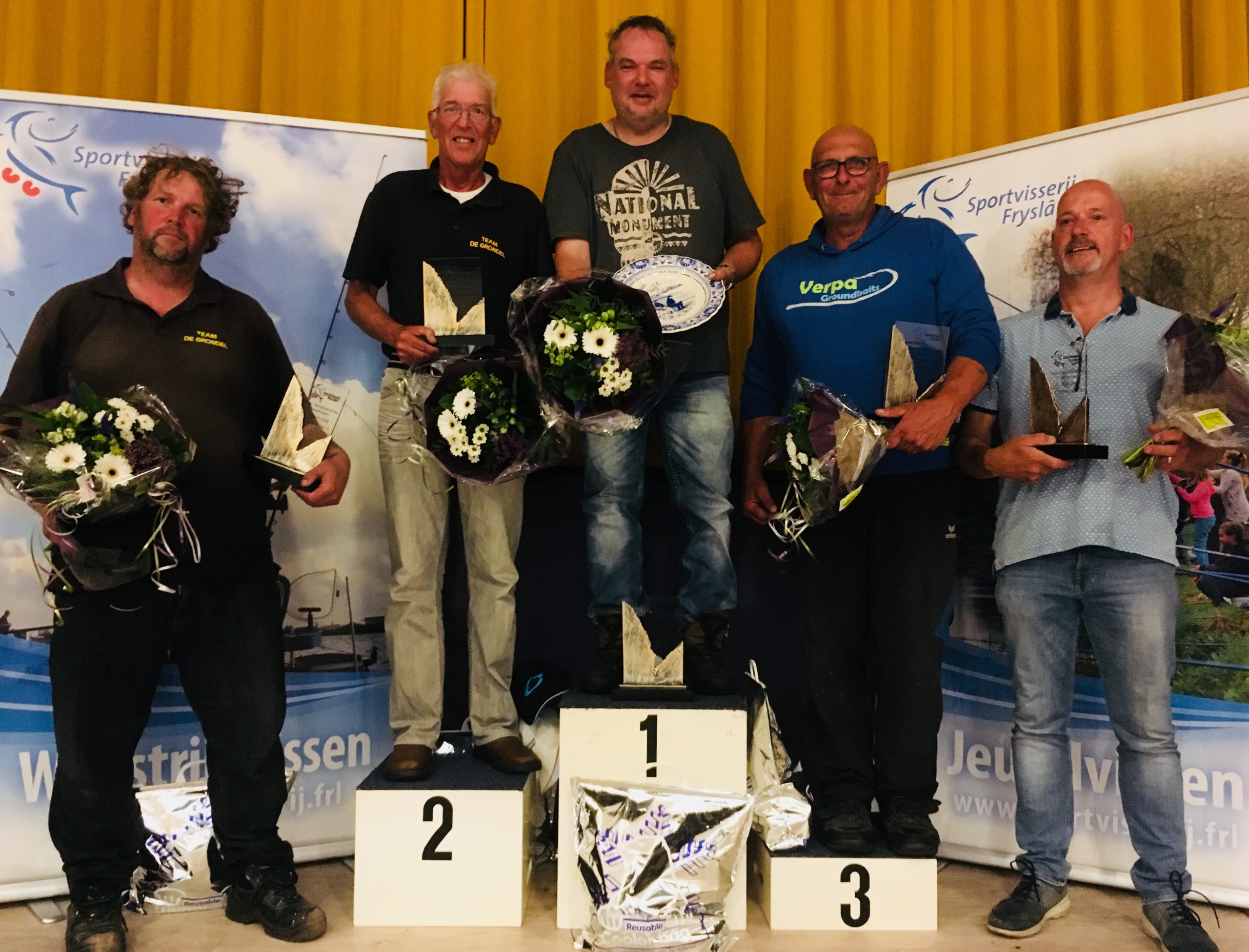 De Fries Kampioen, Rene Tibbesma van Hengelsportvereniging de Snoek, Wolvega, had daarvan 9878 kg in zijn net. Ook vorig jaar was Rene de Fries Kampioen. Dit is een unieke gebeurtenis binnen de Friese sportvisserij en toont maar weer dat Rene een ‘betûft’ visser is met de feeder.. Hij kreeg het Kampioensbord uitgereikt van Gooitzen Hager wedstrijdleider namens Sportvisserij Fryslân.