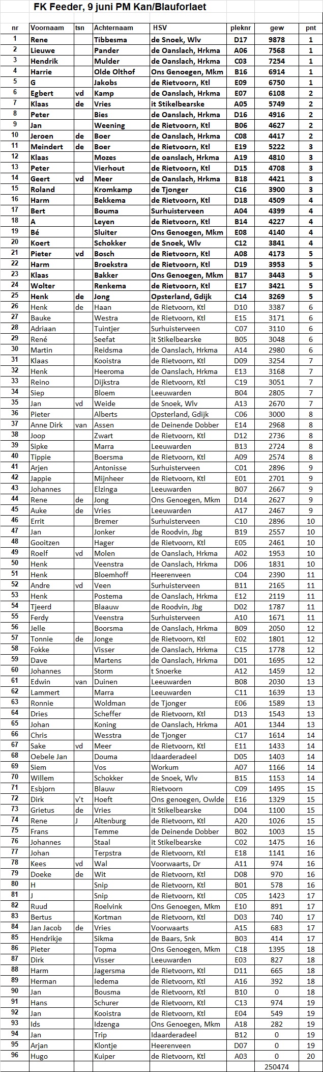 Vandaag, zaterdag 9 juni, vond het Friese Kampioenschap feedervissen plaats op het bekende wedstrijdtraject PM Kanaal Blauforlaet/Reahel. Tevens werd er gebruik gemaakt van enkele steigers bij Kootstertille.