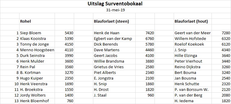 In totaal 41 deelnemers hadden zich ingeschreven voor de strijd om de Surventobokaal. Het inschrijven verliep soepel in Café de Haven en al snel was iedereen onderweg naar het Prinses Margrietkanaal. Voor de deelnemers waren er drie vakken uitgezet. Een vak op Rohel en twee vakken op Blauforlaet waarvan één op de stenen en één op het hout.