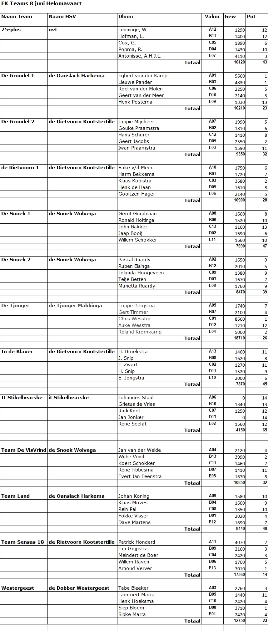 Beide teams hadden hetzelfde aantal punten (23) echter de vijf zeer ‘betoefte’ sportvissers van de Grondel 1 (HSV de Oanslach Harkema) hadden 4 kg meer vis gevangen en zijn derhalve als 2e geëindigd waarmee Team Westergeest genoegen moest nemen met de 3e plek.