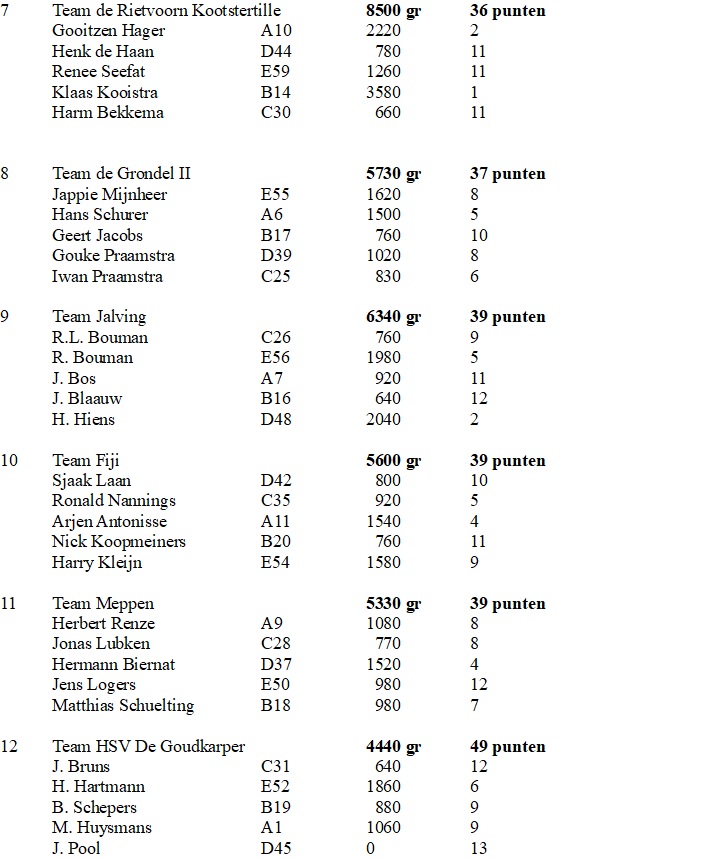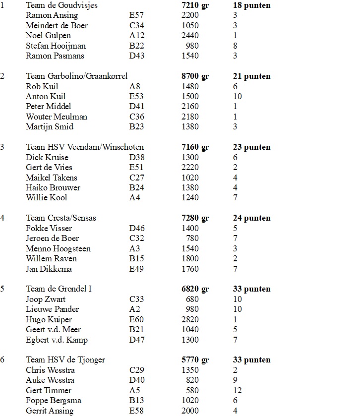 5 team de Grondel I (6820gr.) 33 punten (10, 10, 1, 5, 7) Joop Zwart, Lieuwe Pander, Hugo Kuiper, Geert v.d. Meer en Egbert v.d. Kamp